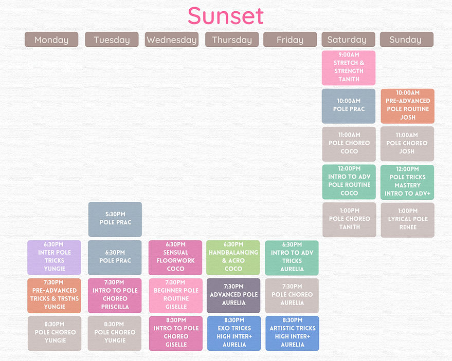All classes will be preparing routines to perform at our end of year Showcase with the exception of some Pole Tricks Only and Stretch/Handbalancing classes.